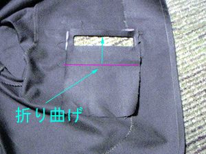 | 裏側へ返す。 | 紫のところで折り曲げ、ポケットの上縁にあてる。 |