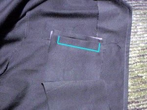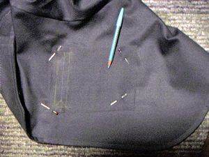 | 裏側に開ける大きさよりたてよこ2センチずつ大き目の接着芯を貼る。 | 表側にポケットの袋布をあて縫い取り線の所を縫う。次に切取り線の所をカッターとはさみであける。 |
