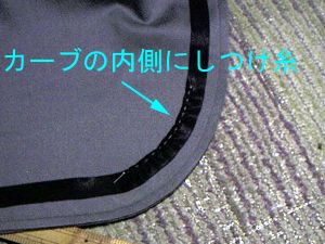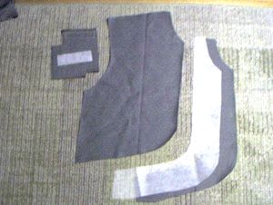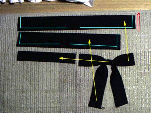 | リボンは2個必要です。首のところとしっぽ用。上の生地はどれも輪になっていて水色の所を縫った後角を切り落としふっ繰り返します。また接着芯が一番上の生地にはつきます。ヨレヨレにしないために。 | 接着芯を貼りふっ繰り返すところ。 |