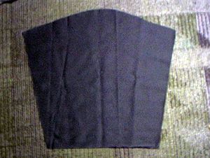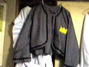 | 材料 ねずみ色・カツラギ110センチ巾を2メートル。白色・ブロード。黒リボン・5メートル。接着芯。参考本 |