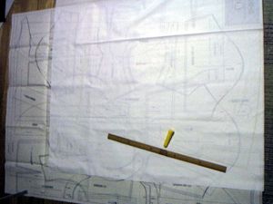| リボンテープも縫い終わり、黄色のバッチも付けました。バッチはビデオケースを切り抜き黄色でスプレーしクリップで留めました。上着完成。 | 市販のスカートの型紙を直接生地に当てて写し取りました。も〜うめんどくさいにょ。裏地用ではないけど膨らんだ感じをだしたいので2枚分。外側用は長く内側用は短く生地をとります。。 |