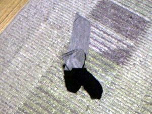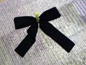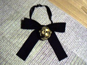 | 一番長い生地を輪にして中心で接着。次に短いのを中心から曲げて接着。乾く間洗濯挟み。 | 鈴を安全ピンでつけ、首まわりにリボンテープを調節してホック留め。リボン完成。 |