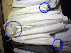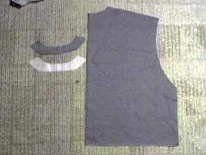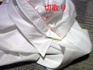 | 市販のワイシャツの衿と袖を切り落とします。 | 青い丸い所が変更となります。まーまためんどくさいギャザーよせ。シャツ完成。 |