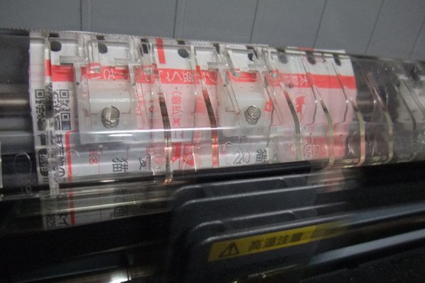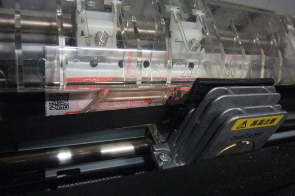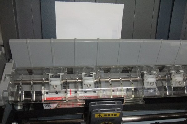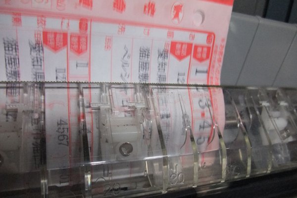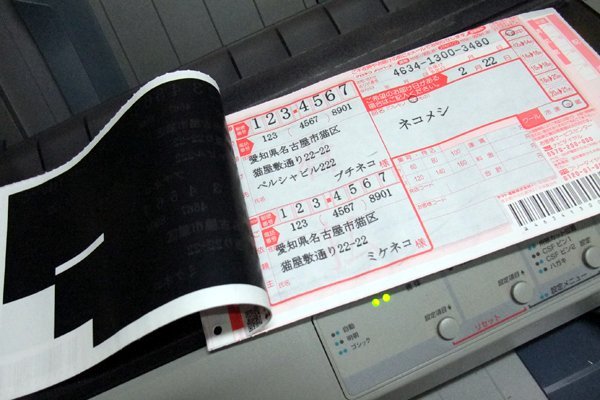 プリンターの上から押しこむように7枚つづりのクロネコ送り状を糊のついたほうからグイグイと押し込みます。 グイグイと押し込まないとなかなか入っていかない。 するとセンサーが感知してウィーンと自動挿入されます。一枚なら毎回同じ位置から印刷がスタートできるけど7枚なので結構バラバラ。よって、手動でスタート位置をプラスチックのこのあたりかなと決めます。 説明書によると前から入れるとなっているけど、うまくいきません。たぶん単表の限界かも。 | |
