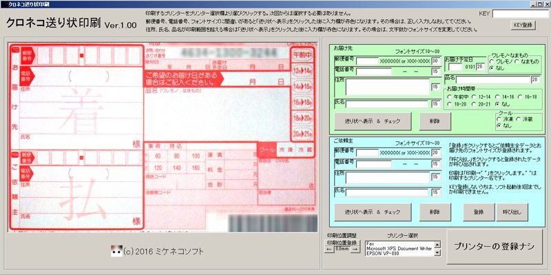 | 「クロネコ送り状印刷.exe」をダブルクリックしてソフトを立ち上げます。 ちなみにwindows10の32ビットでも動くようです。 最初はプリンターの登録ナシと表記されていますのでプリンター選択欄より使用するプリンターをクリックする。 クリックすると"プリンターの登録ナシ"は"印刷→・・・・・"に変わります。 プリンターはEPSON VP-880ですがVP-930がBEST |