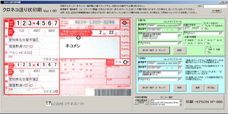 KEY登録しないうちは、ソフト起動後3回までしか印刷できません。 KEY登録したい方は、その旨メール連絡後こちらから振込口座を教えますのでお振込みください。 振込みの確認が出来次第、KEYをメールで送ります。 msvbvm50.dllがないため、プログラムを開始できません。となる方はvb5sp3rt.exeをダウンロードしてインストールしてください。ランタイムパッケージで1M程しかありません。 「(c)ミケネコソフト」と言うのはここのサイトではなくて他サイトで発表しようと思っていたからです。でも、フリーサイトは広告がでたりと何かと制限がありますので、もうここにしました。コスプレサイトで顔バレですが。