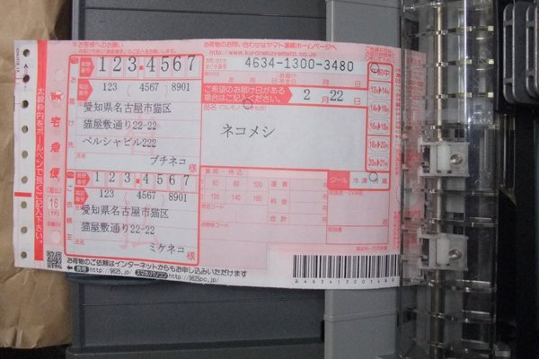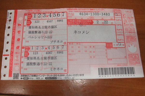お届け先とご依頼主を入力します。 住所欄はお届け先が3行、ご依頼主が2行書き込めますのでエンターキーで改行してください。 郵便番号、電話番号、フォントサイズに間違いがあると「送り状へ表示 & チェック」をクリックした後に入力欄が赤色になります。その場合は、正しく入力してください。 住所、氏名、品名が印刷範囲を超える場合は「送り状へ表示 & チェック」をクリックした後に入力欄が赤色になります。その場合は、文字数かフォントサイズを変更してください。 「登録」をクリックするとご依頼主全データとお届け先のフォントサイズが登録されます。 「呼び出し」をクリックすると登録されたデータが呼び出されます。 印刷は「印刷→" "」をクリックします。" "は印刷するプリンター名です。 画面の表示と印刷がまったく同じというわけではありません。送り状の写真は大きめです。 | |